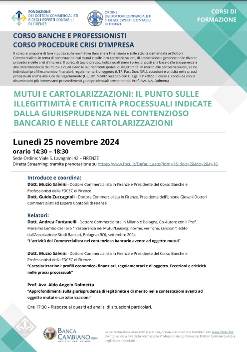 Mutui e cartolarizzazioni-convegno e webinar Odcec a Firenze il 25/11/2024