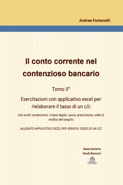 In questa seconda parte si svolgono esercitazioni sulla determinazione del tasso nei conti correnti. Si esaminano, in particolare il tasso legale, l’anatocismo, l’usura, la prescrizione, il saldo 0, il taeg/isc. Tali verifiche possono essere svolte sia con il metodo cosiddetto sintetico, che utilizza i numeri degli scalari, sia con il metodo analitico di ricostruzione di ogni movimento del conto corrente. Questo secondo approccio viene eseguito con l’applicativo excel di ASB che si mette a disposizione, gratuitamente, con il presente volume. Segue un fac simile di perizia, un approfondimento su taeg, la successione storica dei tassi soglia, dei tassi bot, dei tassi legali, dei più importanti articoli del tub.